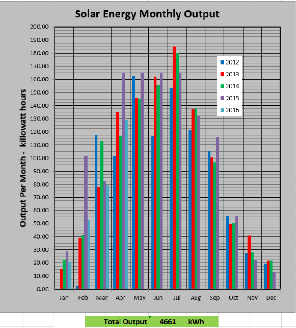 The chart shows the monthly output up to 1st May 2016. The rate of return on investment from installation is approximately 9.7% pa.